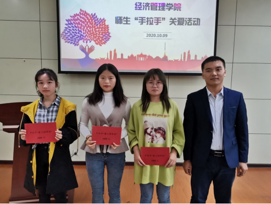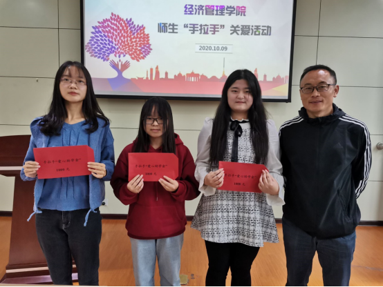 座谈会上,牛成亮老师介绍了师生“手拉手”关爱活动总结了2019年师生“手拉手”关爱活动的开展情况、取得的成果以及财务收支情况。2019年受资助员工代表王俪颖和舒晋香汇报了一年来在学院与老师的关怀下取得的成绩,并对“手拉手”关爱平台和各位老师的指导与帮助表达了感激之情。经贸系党支部书记马风涛和物流系党支部书记刘露介绍了2019年关爱活动开展情况以及部分同学在受资助期间的学习状况的变化,并向同学们提出建议,希望同学们增强主动性,老师们加强交流,只有师生携起手来才能真正帮助到每一位结对员工。随后,各党支部书记向2019年受资助员工发放了“爱心助学金”牛成亮老师通报了2020年关爱活动结对名单,2020年受资助员工代表褚玥进行了发言,表达了自己的感恩之情,表示在今后的学习生活中更加努力,成为一名优秀的老员工