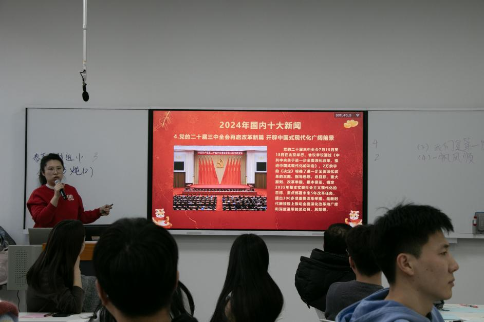 在忆往昔环节,姜力文带领大家回顾2024年的重要事件,从国家航天发展、外交成就,到学校的科研教学突破,再到物流系获得的荣誉和取得的进步,桩桩件件均彰显党建引领下各领域的奋进轨迹,使师生明晰自身在时代与专业发展进程中的坐标与责任,增强使命感与奋斗动力。此外,该环节融入了“党建知识竞答”,深化师生对党的政策方针的理解。现场师生们踊跃抢答,展现了对党建知识储备的广度与深度。