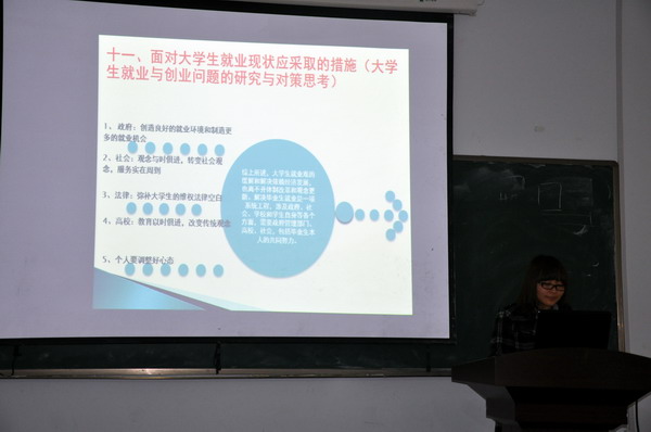 参加答辩会的项目是从学校和学院立项中经过初次答辩筛选出的十个立项,分别进行PPT答辩演示。科研立项的研究课题自选,此次展示的立项基本上是与经济类相关的一些案例的研究和分析。同学们都做了认真准备,包括对研究背景的探索,对研究目的和思路的认识,对调查问卷的精心设计,最后做出分析和结论。其中有对老员工就业状况的分析及法律保障问题的研究,有对山东半岛地区海洋经济发展对陆域经济发展的影响机理与对策,还有对高校学术类社团发展的探究。