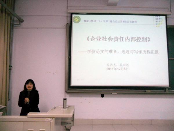首先,花双莲博士做了题为“企业社会责任内部控制——学位论文的准备、选题与写作历程汇报”的报告。报告中,花双莲博士回顾了在中国海洋大学攻读博士期间的心路、学习与研究历程,总结出了应严谨、深入、规范的对待科学研究的宝贵经验。并结合自己博士学位论文《企业社会责任内部控制》深入细致地讲解了学位论文从选题,到查阅文献、整理资料,再到开题直至最后成文的方法及步骤。其讲解生动、有趣且富有内涵,使同学们不仅了解了会计前沿理论和研究方法,还了解了学位论文的写作过程。