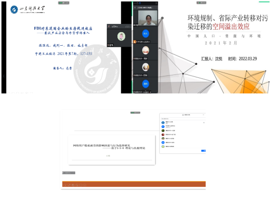 第三场:沈悦同学分享了在《中国人口·资源与环境》上发表的文章《环境规制、省际产业转移对污染迁移的空间溢出效应》。论文主要是对2003—2017年30个省区市(港澳台和西藏除外)环境污染总指数的空间溢出效应进行探讨,构建动态空间杜宾模型研究环境规制、省际产业转移对污染迁移的影响。汇报完毕后,刘军等博士对于实证论文撰写过程中涉及假设提出、变量选择等问题展开了讨论。