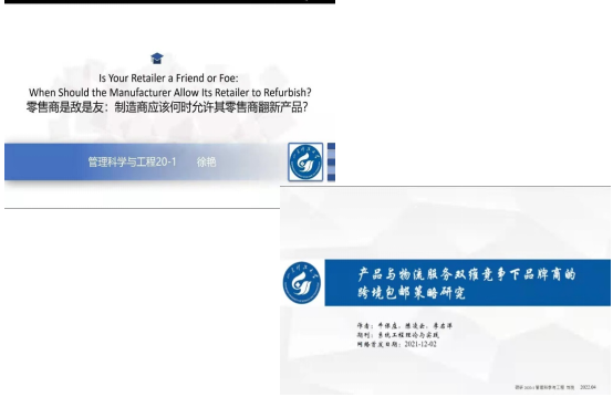 第一场:徐艳同学以Ahmed Timoumi、Narendra Singh、Subodha Kumar在2021年发表在POMS(SCI一区)上的文章《Is Your Retailer a Friend or Foe: When Should the Manufacturer Allow Its Retailer to Refurbish?》进行了讲解。讲解的内容主要包括该论文的研究背景、研究目的、研究假设,模型求解与分析等。最后就两位博士生提出的问题进行了回答,例如彭伟博士提出的产品再制造和产品翻新的区别,寇园园博士提出的消费者对翻新产品和新产品之间的偏好问题等。