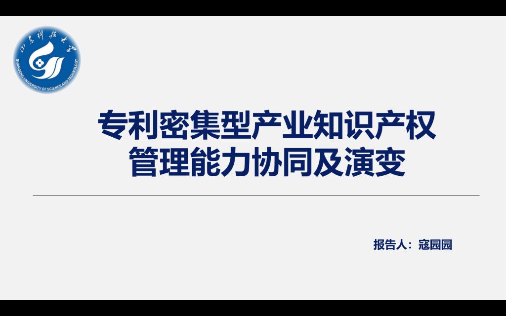 第一场:寇园园同学以陈恒和李明秋等2022年发表在《科学学研究》(基金委A类期刊)上的文章《专利密集型产业知识产权管理能力协同及演变》进行了讲解。讲解的内容主要包括采用组合赋权法确定序参量指标权重,改进传统复合系统协同度模型,构建具有速度特征的专利密集型产业知识产权管理能力协同度综合测度模型;基于15个专利密集型产业2011年-2016年的样本数据,分别从静态和动态视角对我国专利密集型产业知识产权管理能力协同水平及其演变趋势展开实证研究;并提出了相关政策建议,以期为专利密集型产业知识产权管理能力协同度提升提供理论依据等。