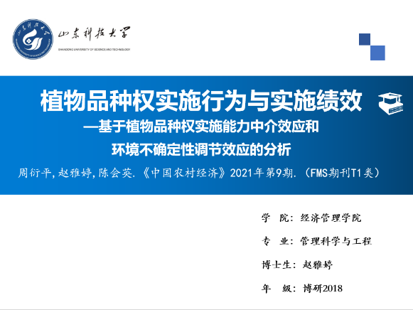 第二场:赵雅婷同学以周衍平、赵雅婷、陈会英2021年发表在《中国农村经济》(FMS期刊T1类)上的文章《植物品种权实施行为与实施绩效—基于植物品种权实施能力中介效应和环境不确定性调节效应的分析》进行了讲解。分享了植物品种权实施的内涵,基于12个省(市)286份来自种业企业、农业科研单位、农业高等院校及个人的调查数据实证分析植物品种权实施行为对实施绩效的影响与作用机制的过程。黄瑶等同学对问卷数据可靠性相关问题进行了讨论。