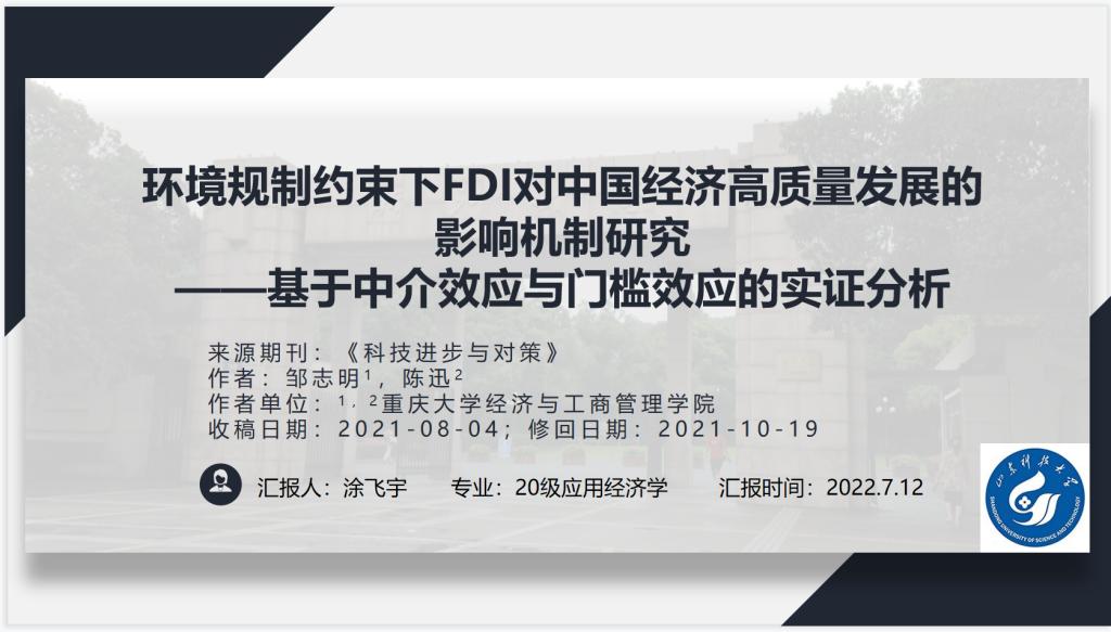 第二场:涂飞宇同学以《环境规制约束下FDI对中国经济高质量发展的影响机制研究——基于中介效应与门槛效应的实证分析》为例进行了讲解,主要分享了FDI对我国技术创新与经济高质量发展的影响过程中存在的中介效应和面板门槛效应。在本次报告中,首先对基本理论进行了阐述,然后通过对论文的研究思路以及中介效应模型和门槛效应模型的分析和讲解,描述了FDI通过技术创新机制作用于我国经济高质量发展的过程和路径。