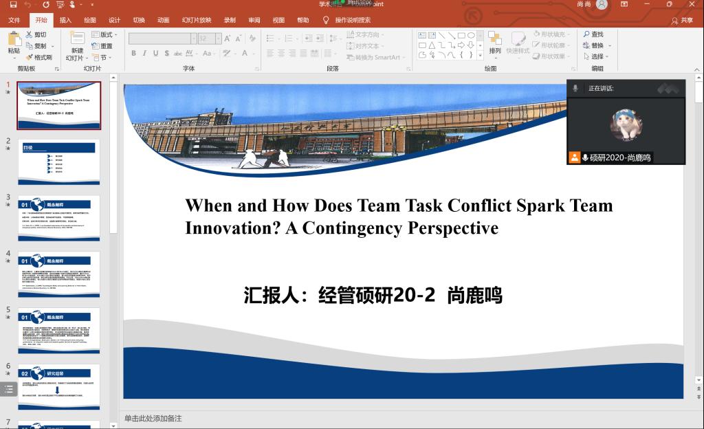 第二场:尚鹿鸣同学以《When and How Does Team Task Conflict Spark Team Innovation? A Contingency Perspective》为例,对基于权变视角下任务冲突与团队创新之间的复杂关系进行了讲解和阐述。该论文首次将残差相对权重分析(Residualized relative weight analysis)应用于交互效应的强弱比较中,发现不管是工作中与人际关系相关的因素(心理安全氛围)还是与任务激励相关的因素(创新鼓励氛围)都是团队利用任务冲突实现信息资源的加工和整合的重要情境因素,对于任务冲突有效转化为团队创新具有同等重要的意义。研究结论指出,管理者应该理性看待团队的任务冲突,不应一味强调压制来回避冲突;相反,设置有效的任务创新鼓励机制,营造和谐的人际关系氛围,将更有可能把任务冲突带来的多样化视角和信息进行加工整合,从而实现团队创新。