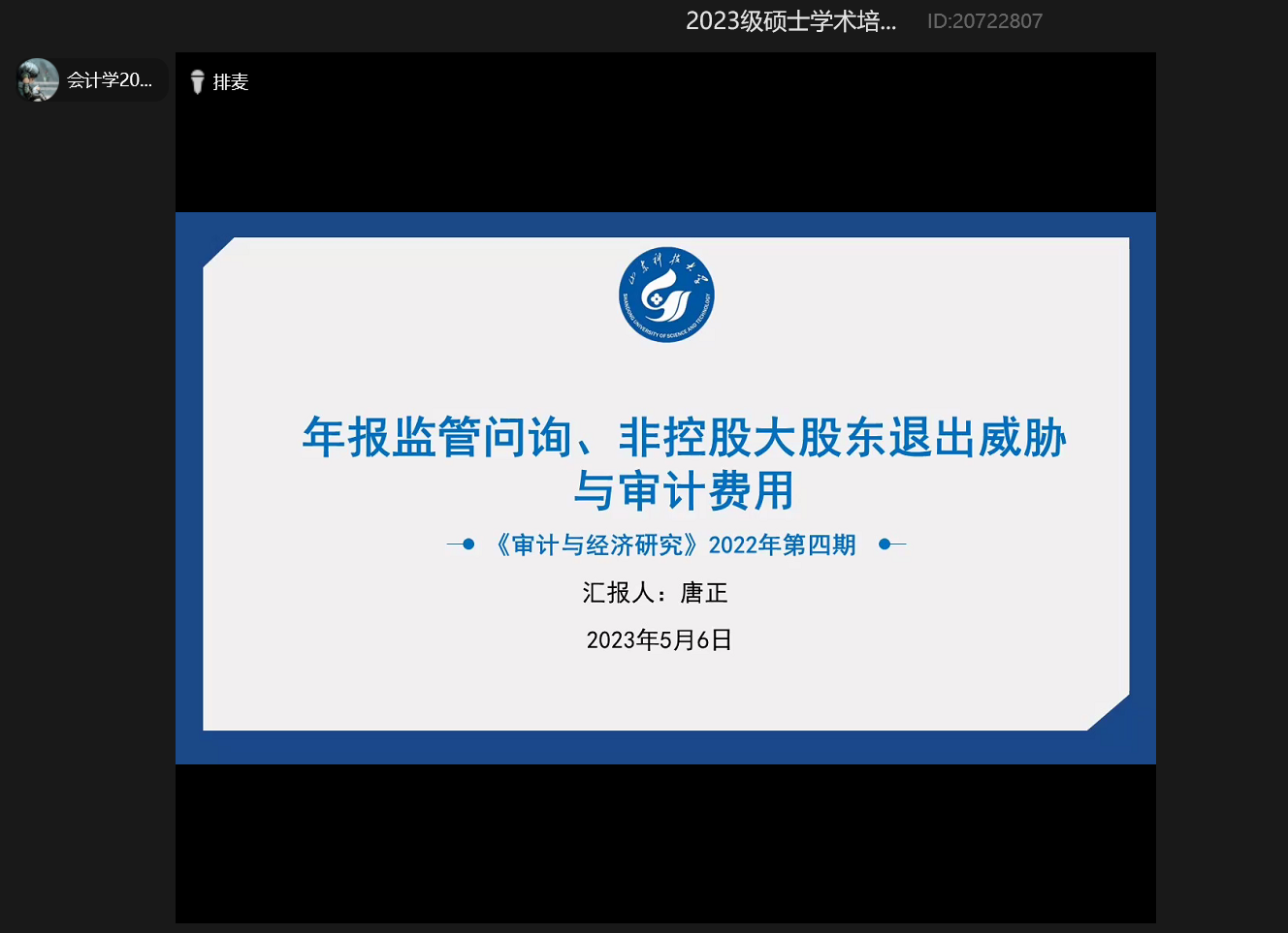 第二场:唐正同学以自己2022年发表在《审计理论研究》的文章《年报监管问询、非控股大股东退出威胁与审计费用》进行了讲解,主要以2016-2020年A股上市公司为研究对象,研究年报监管问询对审计师定价决策的影响机制。在本次报告中,首先对年报监管问询、非控股大股东退出威胁与审计费用之间的相互关系进行了理论分析,然后通过对论文的研究思路以及模型建立过程进行了讲解,研究丰富了年报监管问询在公司治理层面经济后果的研究,扩展了非控股大股东退出威胁和审计费用的相关研究。
