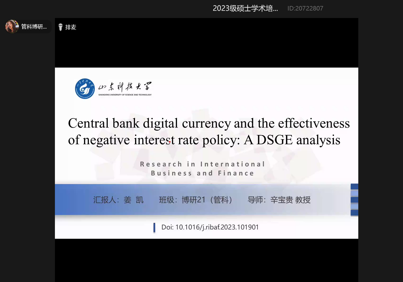 第一场:姜凯同学以自己2023年发表在《Research in International Business and Finance》的文章《Central bank digital currency and the effectiveness of negative interest rate policy: A DSGE analysis》进行了讲解。文章首先介绍了利率的零下限(ZLB)和负利率政策(NIRP),接着引出利率的零下限(ZLB)约束和现金障碍导致在传统法定货币体系中实施负利率政策(NIRP)的效果不如预期的问题,然后考虑在经济中引入中央银行数字货币(CBDC)这一新的货币形式以解决上述问题,最后构建了一个动态随机一般均衡(DSGE)模型来分析引入CBDC后NIRP的有效性。