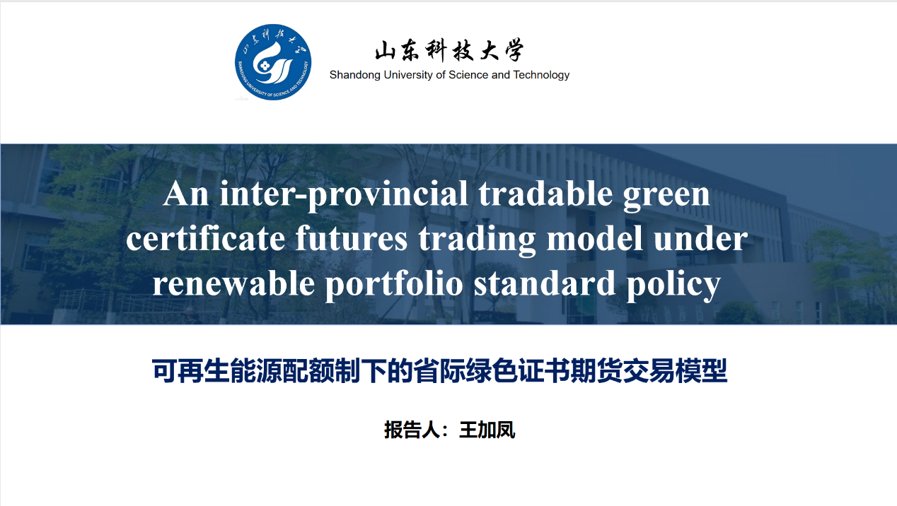 第一场:王加凤同学以自己2022年发表在《Energy》的文章《An inter-provincial tradable green certificate futures trading model under renewable portfolio standard policy》进行了讲解。在本次报告中,首先介绍了可再生能源丰富的地区和电力负荷中心在地理上的反向分布给中国可再生能源组合标准(RPS)目标的实现带来了巨大挑战的研究背景;接着介绍了一个省际可交易绿色证书(TGC)期货交易模型;随后介绍了对中国五省的实证研究过程以及价格的敏感性分析;最后对TGC期货市场的有效设计和RPS政策的成功实施提出了政策建议。