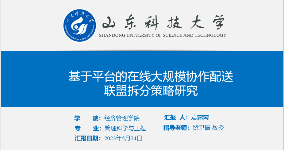 第二场:袁露霞同学以自己2023年发表在《系统工程理论与实践》的文章《基于平台的在线大规模协作配送联盟拆分策略研究》进行了讲解。在本次报告中,首先介绍了平台的在线协作配送模式容易形成大规模联盟,难以在合理时间内计算出成本分摊方案的研究背景;然后对在线协作配送模式分析、模型描述、联盟拆分必要性、联盟拆分思路、联盟拆分方案种类分析进行了简单的介绍;接着介绍了大规模联盟两阶段拆分策略,其中主要介绍了两阶段拆分策略设计、两阶段拆分策略步骤、拆分策略影响因素分析方面;随后对数据实验与结果分析进行了讲解;最后讲述了本文的研究结论与意义。
