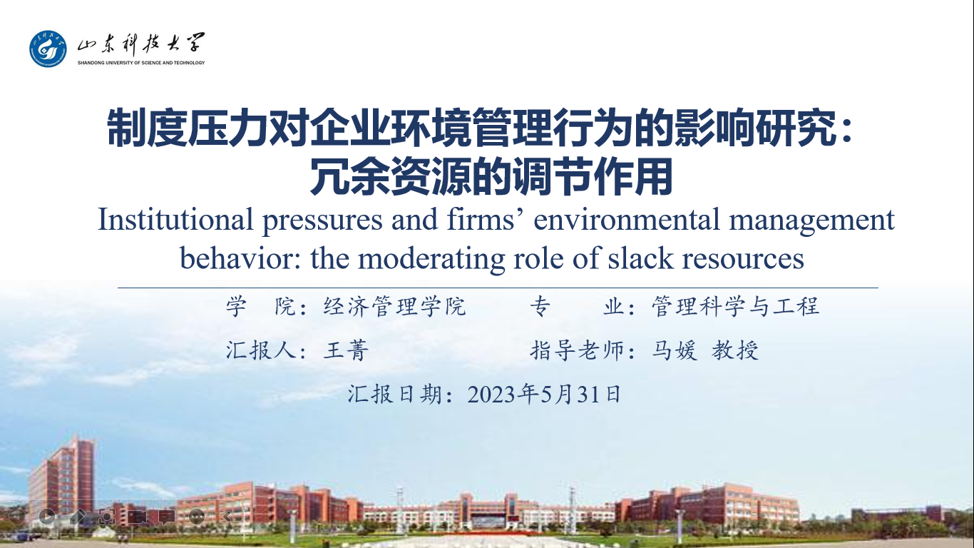 第一场:王菁同学以自己2022年发表在《JOURNAL OF ENVIRONMENTAL PLANNING AND MANAGEMENT》的文章《Institutional pressures and firms' environmental management behavior: the moderating role of slack resources》进行了讲解。在本次报告中,首先介绍了企业环境管理行为的实质性和象征性维度;接着基于制度理论讲解了强制压力、模仿压力和规范压力对这两个维度的影响;随后介绍了本文的研究过程;最后企业环境管理行为提出了政策建议。