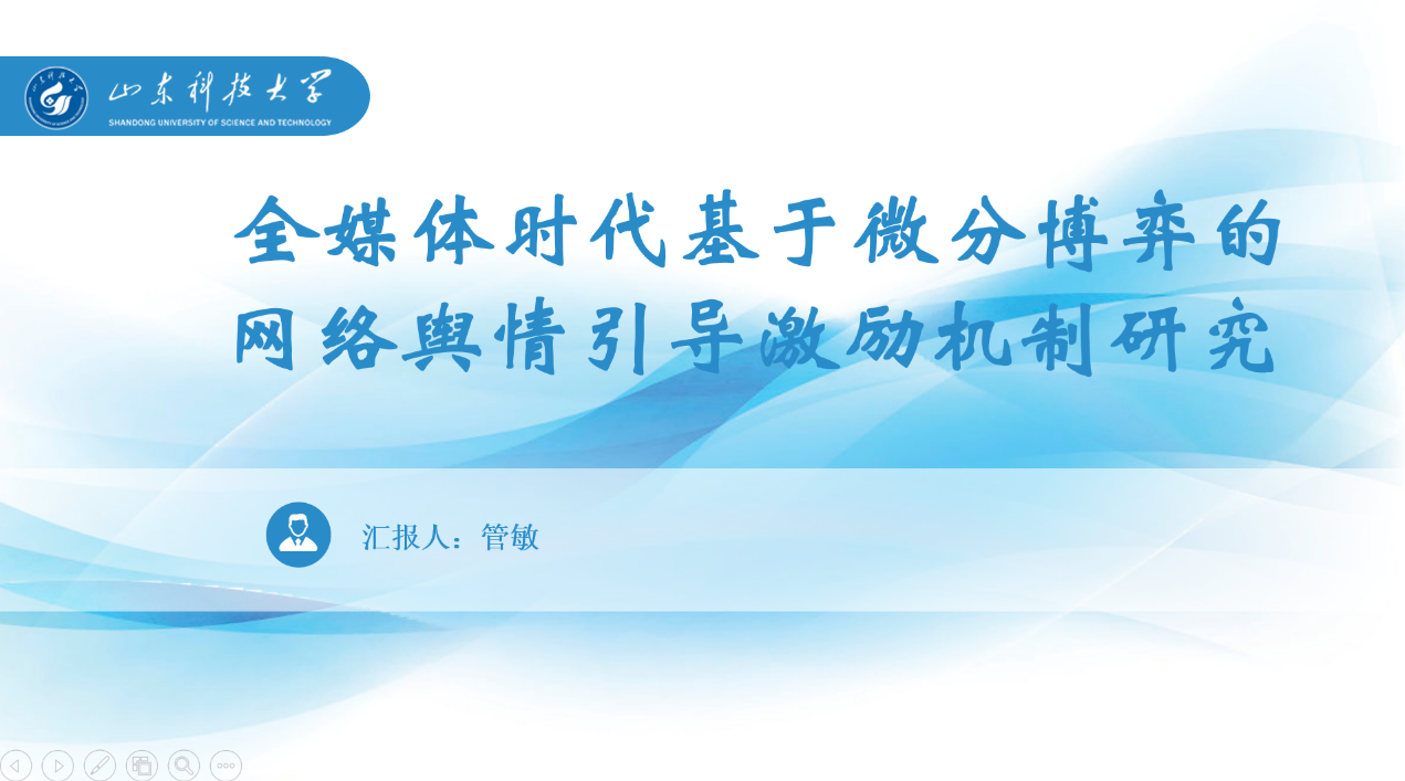 第二场:管敏同学以自己2023年发表在《中国管理科学》期刊的文章《全媒体时代基于微分博弈的网络舆情引导激励机制研究》进行了讲解。在本次报告中,首先介绍了全媒体时代赋予网络舆情独特的传播特征,也对其监管与治理提出了更高的要求的研究背景;然后对网络舆情传播的动态性与持续性、网络舆情实际传播过程、微分博弈的研究范式进行了简单的介绍;接着介绍了由监管主体、网媒、网民构成的五种网络舆情传播情景;随后对不同情景下各主体的均衡策略的求解过程进行了讲解;最后讲述了本文的研究结论与意义。