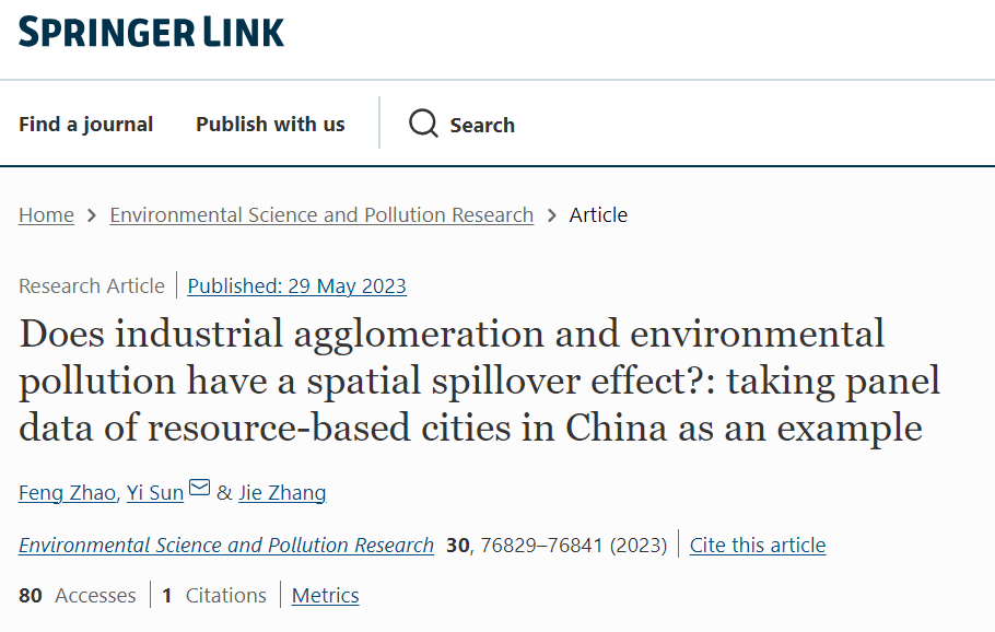 公司硕士生孙峄(导师:赵峰教授)的论文“Does industrial agglomeration and environmental pollution have a spatial spillover effect?: taking panel data of resource-based cities in China as an example”在环境经济与管理领域国际期刊《Environmental Science And Pollution Research》(SCI,IF=5.8,中科院JCR三区)发表。