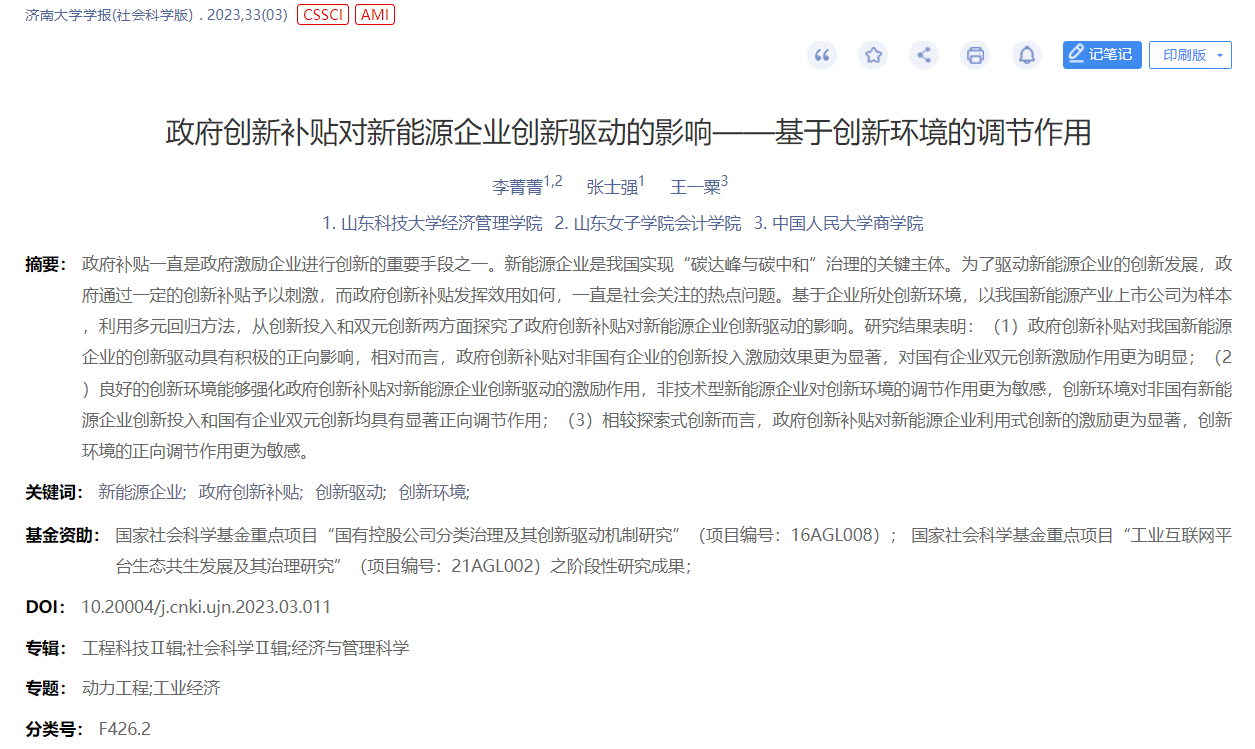 公司博士生李菁菁(导师:张士强教授)的论文“政府创新补贴对新能源企业创新驱动的影响——基于创新环境的调节作用”在中文期刊《济南大学学报》(社会科学版)(CSSCI,IF=1.6)发表。