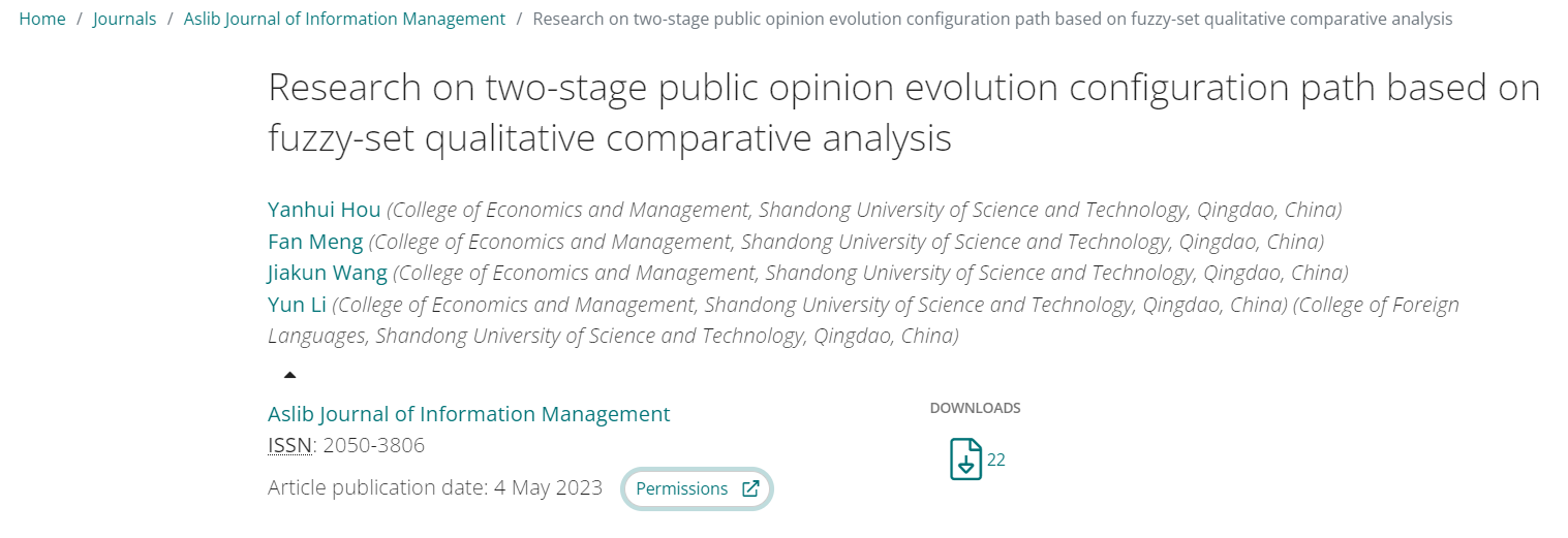 公司硕士生孟帆(导师:侯艳辉副教授)的论文“Research on two-stage public opinion evolution configuration path based on fuzzy-set qualitative comparative analysis”在管理领域国际期刊《Aslib Journal of Information Management》(SCI,IF=2.6,中科院JCR四区)发表。