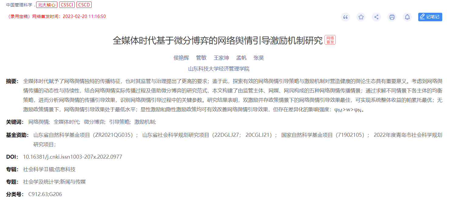 公司硕士生管敏(导师:侯艳辉副教授)的论文“全媒体时代基于微分博弈的网络舆情引导激励机制研究”在管理学领域中文期刊《中国管理科学》(CSSCI,IF=5.5)发表。