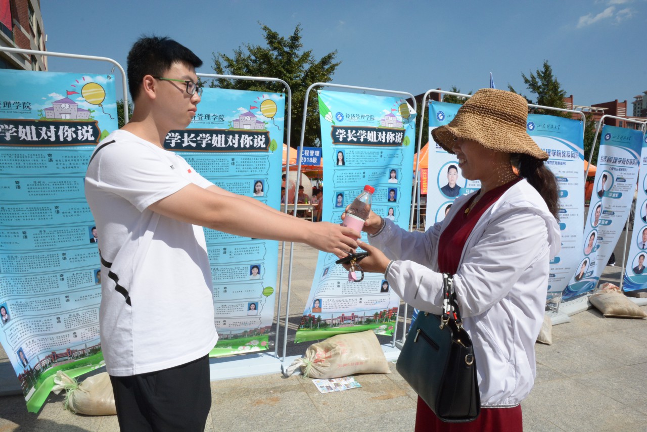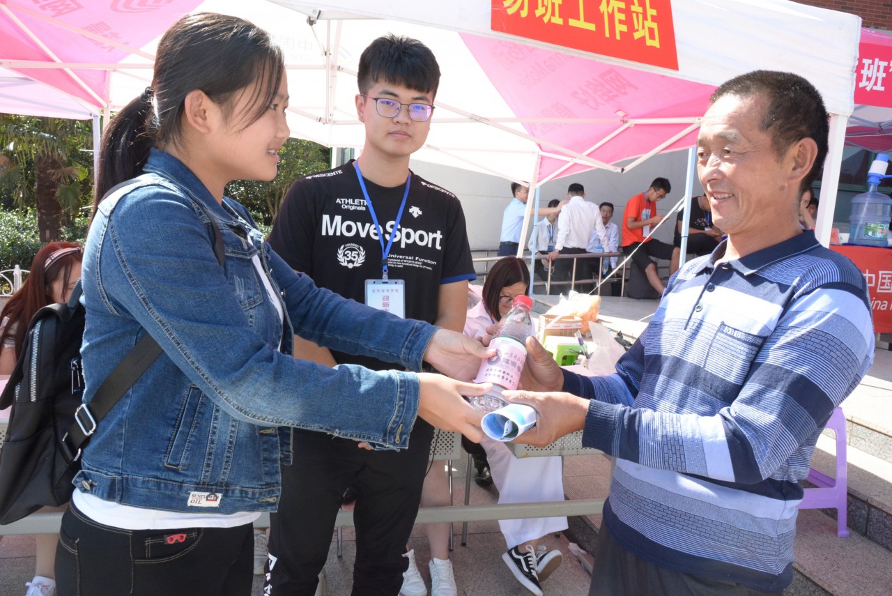 活动过程中,学院迎新志愿者仔细的将精心设计制作的LOGO贴在矿泉水瓶上,在学院团委书记陈永磊的指导下,高年级的学长向师弟师妹们讲解了“我给爸妈敬杯水,爸爸妈妈您辛苦了!”的内涵。听过学长的细心讲解,羞涩的新同学向自己的父母亲献上一瓶清泉,爸爸妈妈们接过后露出了欣慰的笑容。