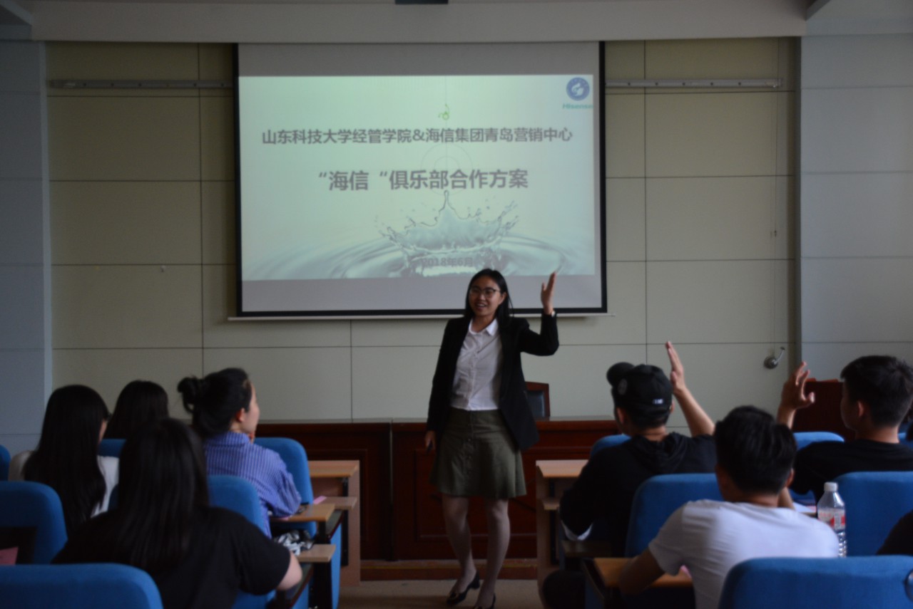首先,通过观看海信集团的宣传片,同学们对海信集团有了初步的了解。会上,徐晶让同学们分享他们对海信集团的认识。随即,她讲述了自己与“海信”的故事,选择海信集团的原因以及她的初步目标——“市场培训师”。接着,徐总从整体介绍、俱乐部成立目的、活动内容、合作延伸四个大的方面展开叙述,让同学们进一步了解海信公司的文化与实力。在竞争力日渐激烈的市场上,海信公司以“诚实、正直、务实、向上”的企业核心价值观为引导,坚持“技术立企、稳健经营”的发展战略,从92年4.1亿的年销售额稳健经营到17年1110亿的年销售额。海信公司借助新技术,发展了通信、智能、交通系统、医疗等新型产业,成为新兴的科技型企业。多元化的产业与巨大的规模无不吸引着同学们争做校园大使、校园实习生的兴趣。徐总指出人才永远是焦点。海信集团以"求、用、育、晋、留"的理念对待员工,通过培训实习提高员工的能力。