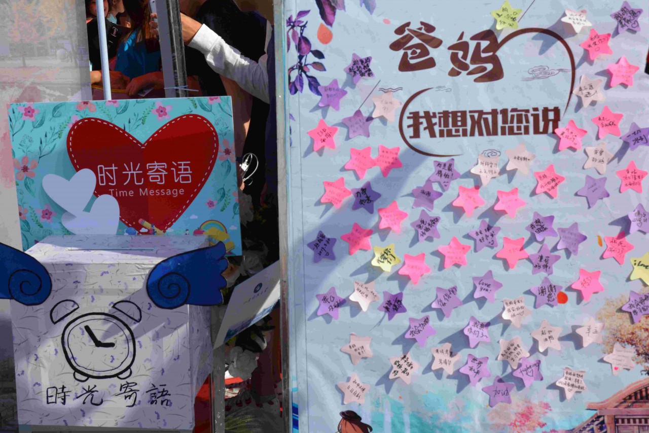 在迎新现场开展的“时光寄语”——写给未来的自己主题活动吸引了新生的目光。一张张写满爱与梦想的小卡片像一颗颗种子种在科大,将在经管这片沃土生根发芽!
