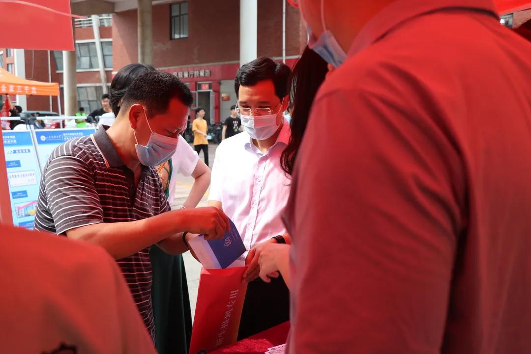 公司领导班子来到迎新点,仔细询问报到情况,与报到的新生亲切交谈。