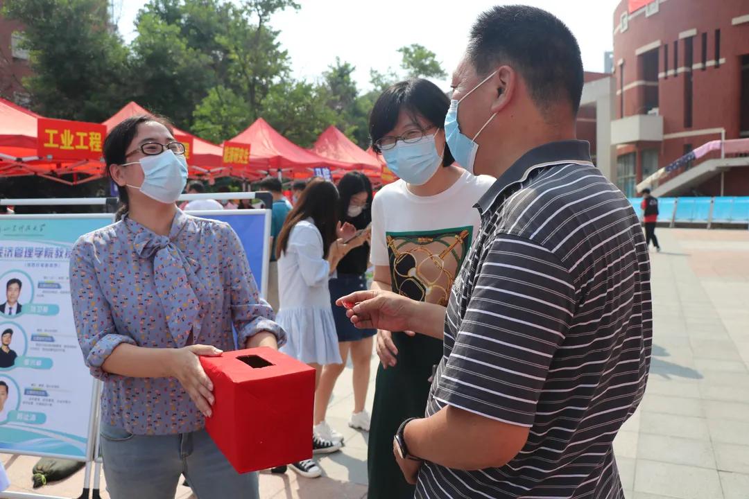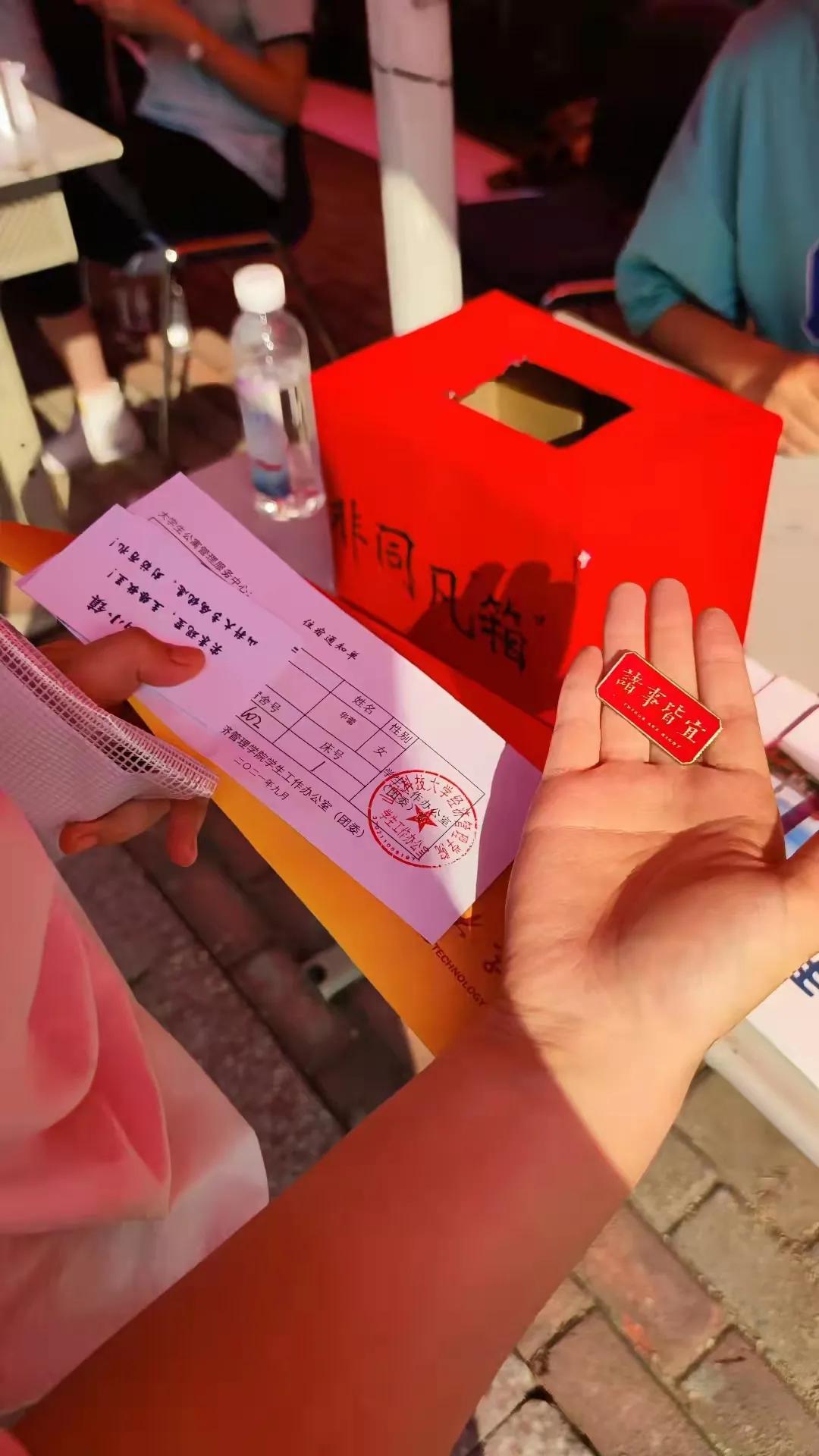 同时迎新现场开展了“新生抽盲盒”活动,学院为每一个新生准备了一枚祝福语徽章,新生在学院报到注册点可以在非同凡“箱”、与你“箱”遇、心“箱”事成的箱子中盲抽一个小胸针,带着“未来可期、逢考必过、万事胜意、平安喜乐、诸事皆宜、好事发生”等字样的祝福徽章表达着学院祝福新生在此刻启程,度过一个有意义的老员工活的心愿,抽到徽章后的萌新们纷纷将其别在胸前。