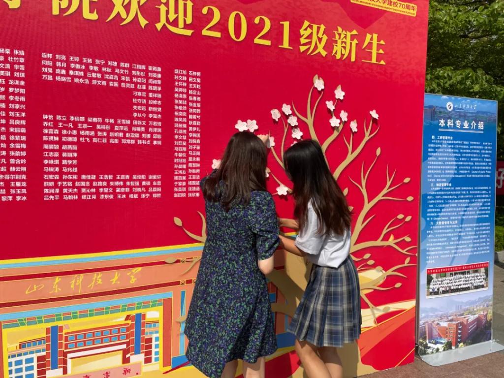 为让萌新感受到学院的关爱,缓解到校后的紧张感,学院精心准备了新生打卡墙,用新生姓名拼成的“2021”巨大字样在迎新报到处的墙上格外亮眼,“2021”字样旁边的果实树,新生可以在“花瓣”便利贴写下心愿,贴到果实树上,记录下他们在人生新的起点上的美好期待和愿景。