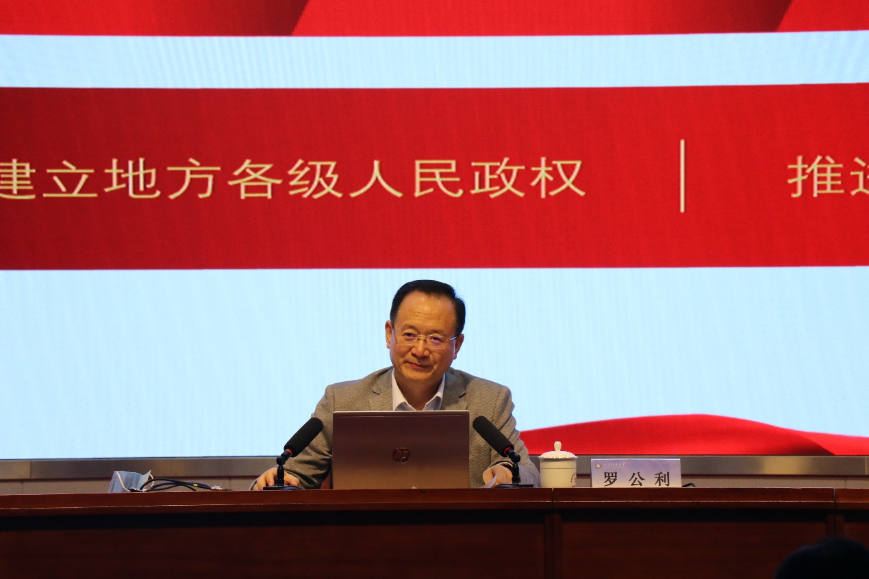 罗公利以《弘扬光荣传统,赓续红色血脉,凝聚起奋进新时代的强大精神力量》为题,围绕“百年奋斗伟大成就”、“赓续精神血脉相传”、“以史为鉴开创未来”、“勇担使命强国有我”四个主题展开叙述。他通过讲述建党百年来的感人故事和历史标志性事件,多角度、全方位阐述了习近平总书记“七一”重要讲话的精神内涵与重大意义。
