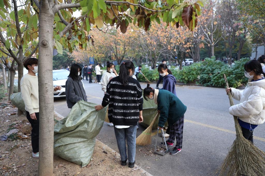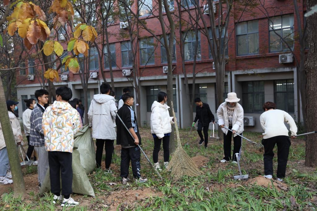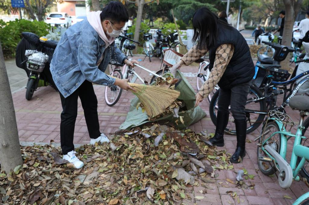 师生们分工合作,带着铁锨、扫帚等工具对区域内的落叶、杂物、垃圾进行了清理,并集中摆放了学院周边的自行车和电动车,维护了校园的干净整洁。
