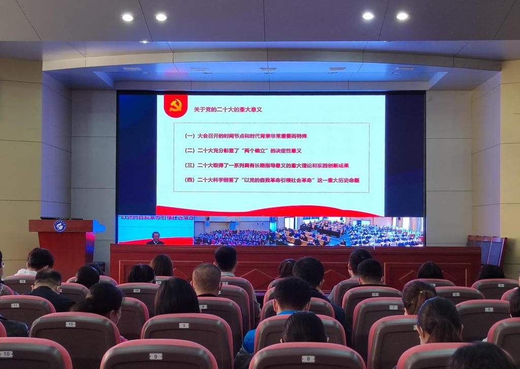 为深入学习宣传贯彻党的二十大精神,在师生当中掀起学习热潮,11月18日,永利集团304am官方入口组织全体教师、员工代表在公司楼四楼报告厅集中聆听党的二十大代表、省属高校学习贯彻党的二十大精神宣讲团成员、公司党委书记罗公利关于党的二十大精神宣讲报告。