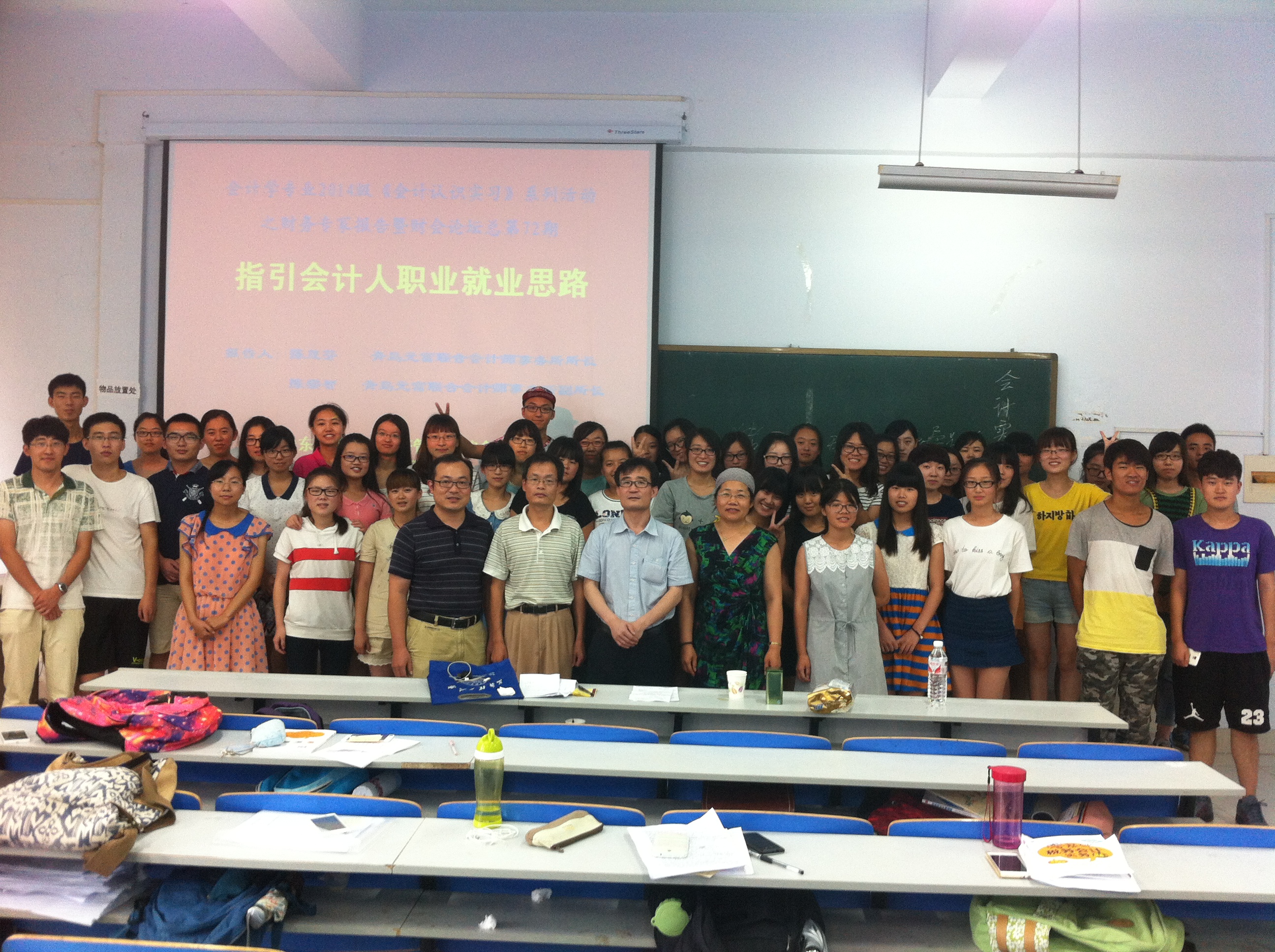 2015年7月22日,会计学专业2014级《会计认识实习》系列活动之财务专家讲座暨《财会论坛》总第72期成功举办,青岛元富联合会计师事务所陈茂芬所长和陈宗智副所长为会计学专业2014级全体同学做了“指引会计人职业就职思路”主题报告。会计系主任张月玲教授主持报告会。