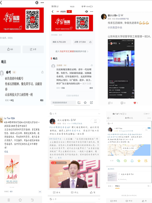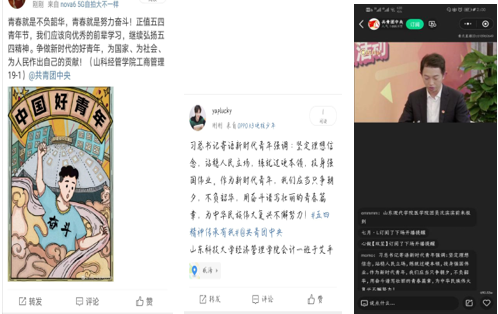 五四青年节期间学院公众号推送“青春心向党 建工新时代”“五四运动101周年,一起回顾山科青年战疫之路”等微信推文,在QQ空间发起了“五四精神、传承有我”接力活动,起到较好的宣传效果。此外,学院各团支部全员学习了“青年大学习”五四特辑,学习了习近平关于纪念五四运动、弘扬五四精神的重要讲话精神。
