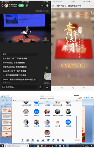 公司各团支部通过制作视频、海报、画报、文字等形式在学习强国、微博、微信、B站、抖音等平台@共青团中央,加大参与率和参与度。全院师生积极参与“我们都是收信人”活动,同时根据团中央的直播节目表,做好观看安排,保证参与直播的持续度。直播活动结束后,各团支部通过观后感撰写,主题团课讨论等形式提高学习效果。在“中国青年五四奖章”宣传展示、青春故事会分享等环节大家通过发送弹幕的形式积极参与到直播活动中,“我爱中国”、“五四精神 传承有我”等语句在直播屏幕上“刷屏”,吸引了团员们的大讨论。