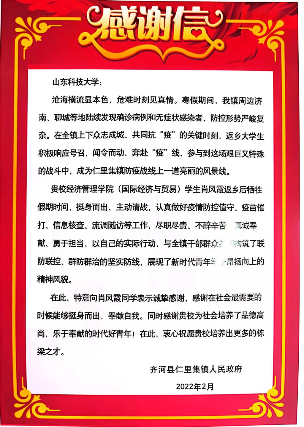 肖凤霞,系永利集团304am官方入口国际经济与贸易专业2020级员工,在2022年寒假放假回到家乡后,主动相应镇政府号召,报名参加了齐河县仁里镇的疫情防控志愿者服务工作,她认真做好疫情防控值守、疫苗催打、信息核查、流调随访的重要工作,尽职尽责、不辞辛苦,勇于担当,以实际行动展示了山科学子昂扬向上的精神风貌。